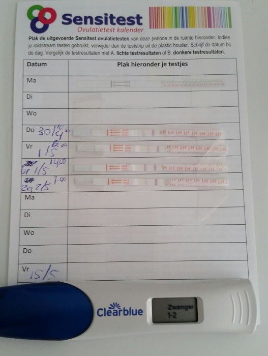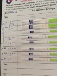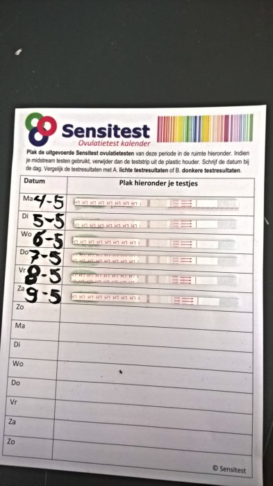 "Ik heb de afgelopen dagen de ovulatietesten gedaan. Duidelijke streep op donderdag 21.00 en vrijdag om 6.30 uur. Ik heb een iui gehad op vrijdag om 11.30. Op vrijdagavond wordt de streep weer lichter. Ik duim voor de goede timing. Wat denken jullie?"