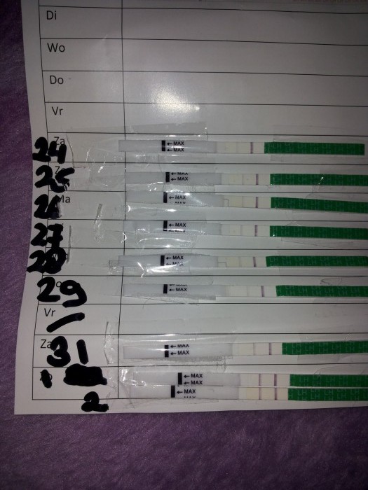 "Het duurde even, maar volgens mij had k mijn eisprong op woensdag 21 januari. Op dinsdag 20 januari was het streepje nog niet zo duidelijk als op woensdag. "