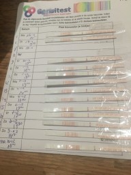 "Gedurende 10 dagen getest bij een gemiddelde cyclus van 25 dagen. Hoewel er tweemaal een licht streepje te zien is (3e en 4e van onder), durf ik niet te stellen dat het een positief resultaat is geweest. Tests zelf overigens makkelijk genoeg in gebruik."