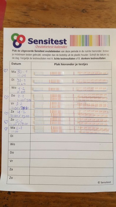 Onze reactie: "Dit ziet er wel goed uit. Eerst een negatieve ovulatietest, en dan op Valentijnsdag notabene 2 positieve ovulatietesten met 2 duidelijke streepjes. Jullie timing was ook prima, eigenlijk hoef je hierna niet verder te gaan met testen. Nu beginnen de 2 wachtweken. Vanaf 28 februari kun je een betrouwbare uitslag op je zwangerschapstest verwachten."