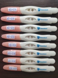 "1e test op de dag dat ik ongesteld moest worden, tweede 2 dagen later en de derde weer 2 dagen later! Gebruikt in combinatie met ovulatietesten. Top! "