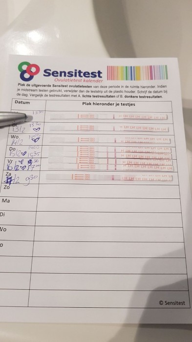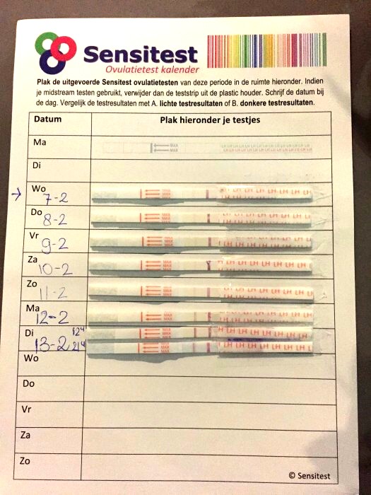 "Oktober mijn spiraal eruit laten Halen. December begonnen met het proberen om zwanger te worden. 30 Januari tm 2 Februari ongesteld geweest en daarna volgens 4 ovulatie calculators 10 Februari begonnen Met sensitest voor het eerst te gebruiken om achter mn ovulatie te komen en of alle 4 De apps wel betrouwbaar zijn. Maar Nee! Dankzij Sensitest zie ik dat deze dagen mn ovulatie eraan Komt en zie vandaag een hele donkere Streep. Ja toch? Zal vandaag mn ovulatie zijn? We zijn in order geval Dankzij De ovulatie Test van Sensitest nu op de hoogte dat de apps niet kloppen en we nu volgens mij goed zitten qua ovulatie. "