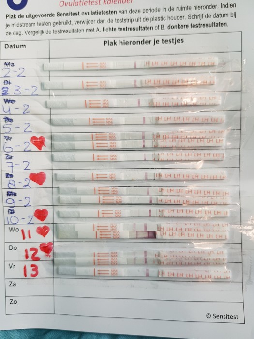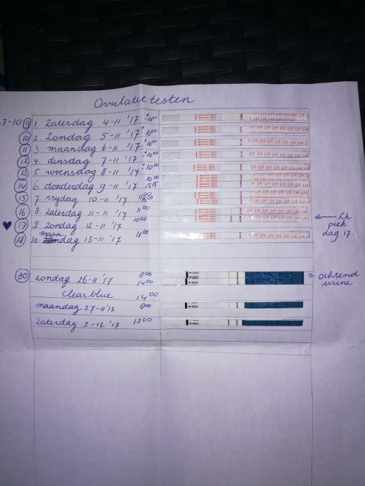 "Eind oktober 2017 mijn 1e menstruatie gehad na 12 jaar pilgebruik. Op 12 november is duidelijk een 2e dikke streep te zien. Op deze dag ook gemeenschap gehad en het resultaat is op zondag 26 nov duidelijk te zien! Dankzij de ovulatietesten kon ik mooi mijn cyclus bepalen. Helaas is ons avontuur bij 9 weken(27-12) mis gegaan en nu net weer begonnen met de ovulatiesticks. Volgende week waarschijnlijk een LH piek en dan binnekort hopelijk weer een mooi resultaat naar jullie sturen! Xx"