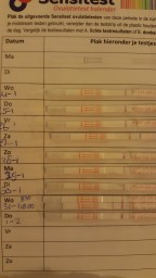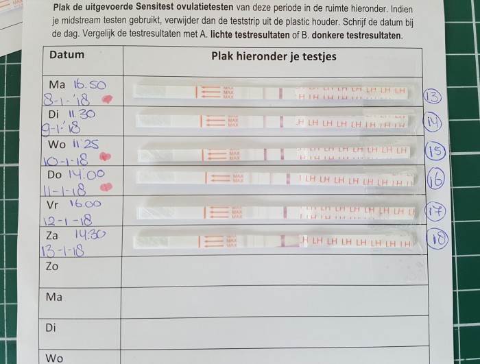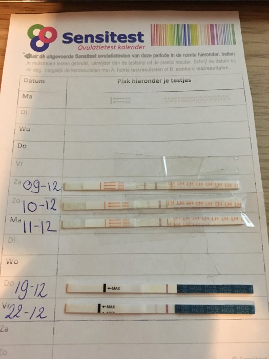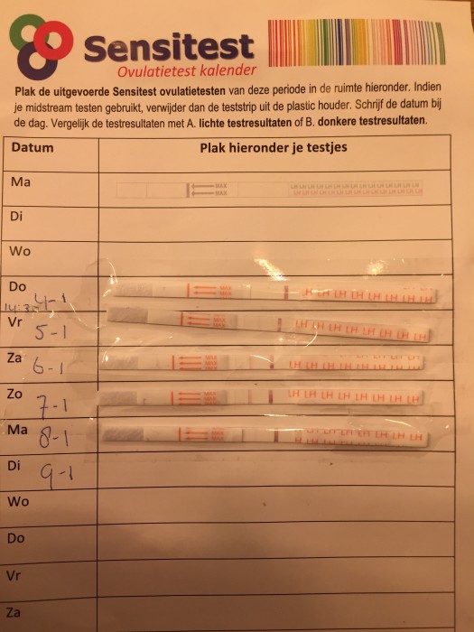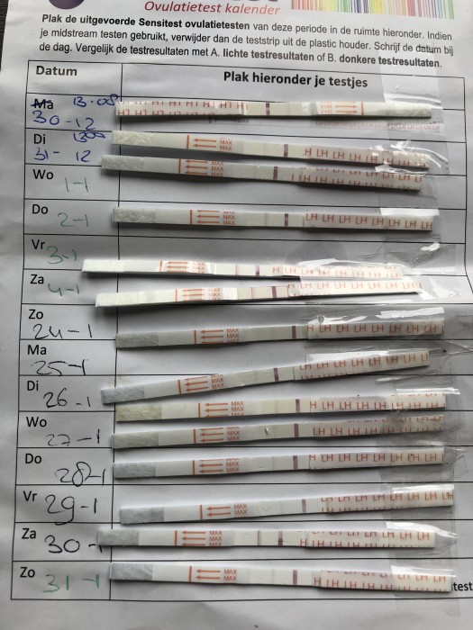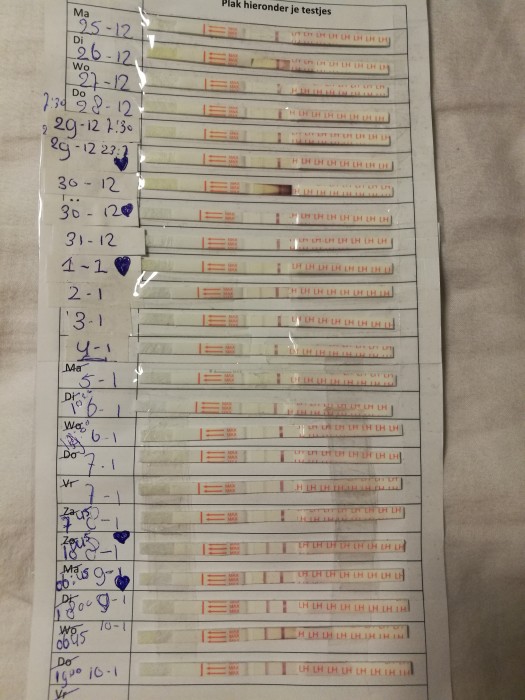 "Op de foto is een ovulatietest kalender te zien. Hierop zie je duidelijk een LH-piek op maandagochtend, 8 januari."