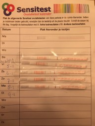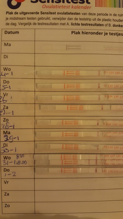 "Ik heb een hele lange cyclus zoals je kunt zien op de foto. Maar door de ovulatietesten van sensitest kon ik toch mijn piek vinden! Uiteraard geklust rond die datums. Dus nu afwachten..... "
