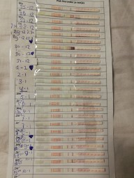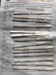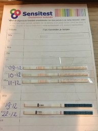 "Mijn cyclus duurt gemiddeld 33 dagen en mijn eisprong zou dus volgens berekening rond de 10e plaats vinden. Op bovenstaande foto van mijn ovulatietesten zie ik rond de 6e en de 9e een wat donkerdere streep. Die van de 10e is weer lichter van kleur. Het is me niet helemaal duidelijk of ik nu een eisprong gehad heb en wanneer.. de testen zelf vind ik wel erg fijn en gebruiksvriendelijk."