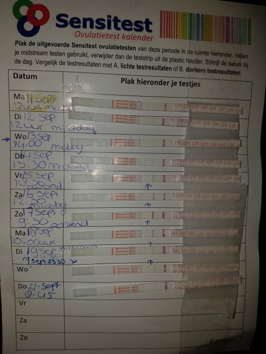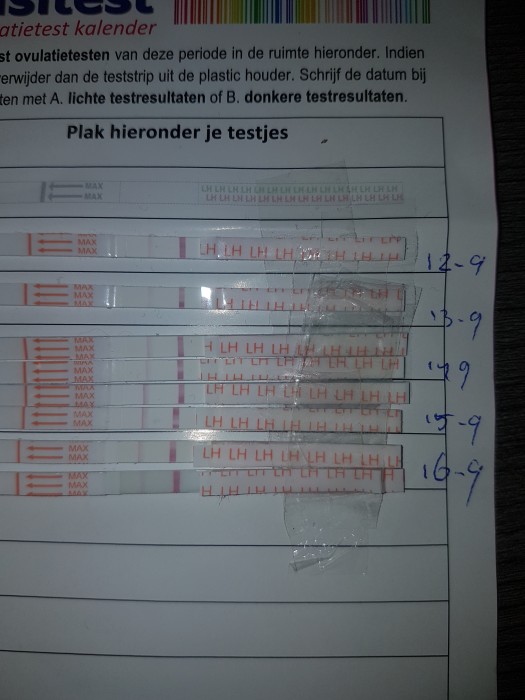 "Super blij met de testen. Volgens mij had ik 20 sept mijn eisprong en hebben die avond geknuffeld. Nu hopen dat het gelukt is."