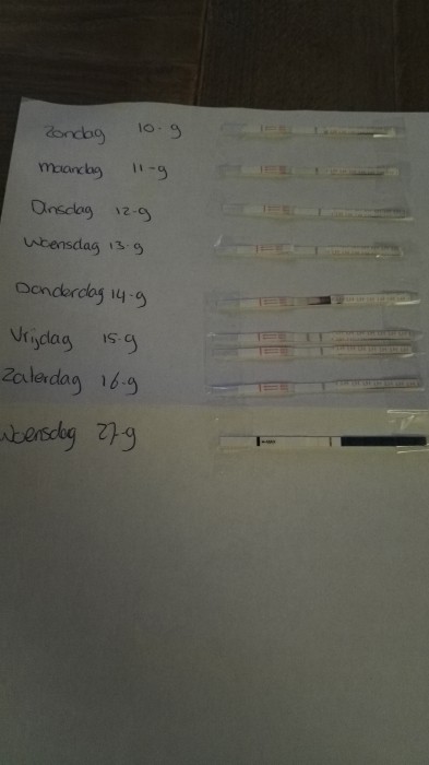 "Vanaf 11 september 2017 zag ik al een heel licht streepje en werd steeds donkerder vanaf 15 sept waren de 2 strepen erg zichtbaar tot met 19 september. "