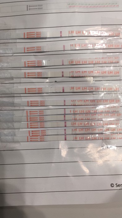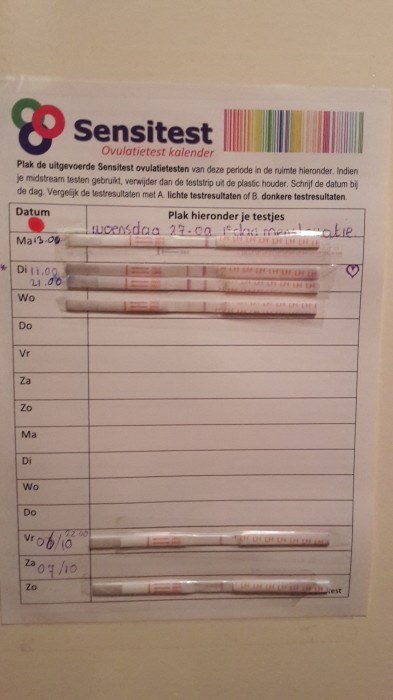 "Woensdag 27-09-2017 eerste dag menstruatie. Begin test op vrijdag 06-10 geen piek. Op dinsdag 10-10-2017 een LH piek. Nu maar even afwachten...."