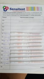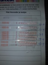 ps: Het testresultaat van de 14 is niet geheel duidelijk. Dit komt doordat de kleurstof niet goed is doorgelopen. Je kunt dit in het vervolg voorkoen door de test iets langer de tijd te geven om urine op te nemen. Zie je dat de kleurstof niet doorloopt of erg langzaam? Hou de test dan nogmaals even in de urine. "