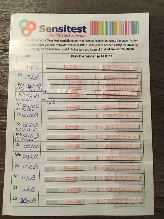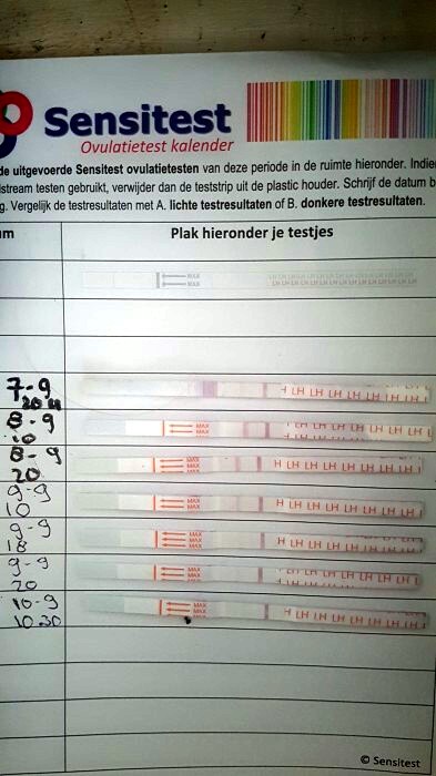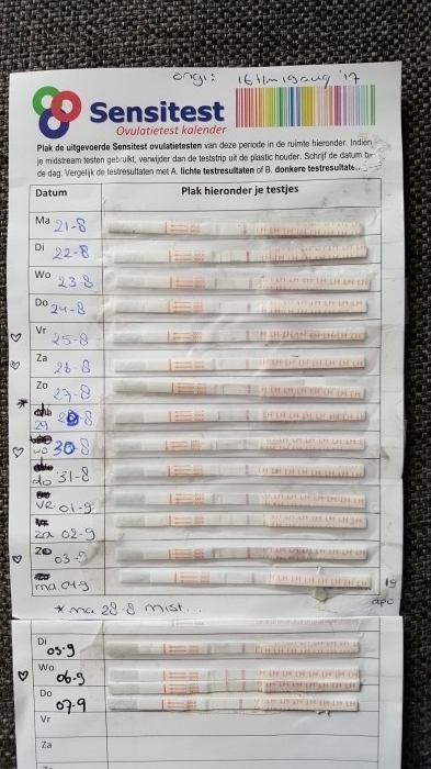 "Wij proberen inmiddels 2.5 jaar zwanger te worden, waarvan 2 jaar met teststaafjes. Het is april 2016 gelukt, helaas geëindigd in een miskraam. Volgens de gynaecoloog is het pech dat het nu nog steeds niet lukt, maar we mogen ieder moment hulp inschakelen. Toch proberen we het eerst nog even zelf. Ik heb een cyclus van 27 dagen, de piek vond plaats op de 14e. Mijn man heeft helaas ook zelf een ejaculatie gehad op 14-9 in de ochtend. Hierdoor weet ik dat de kans klein is dat er genoeg `verse` zaadcellen bij zijn gekomen die avond. Toch hebben we het `s avonds weer samen geprobeerd ivm de piek, de timing was wat dat betreft prima. Nu maar weer afwachten tot de testtijd. "