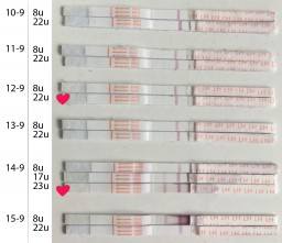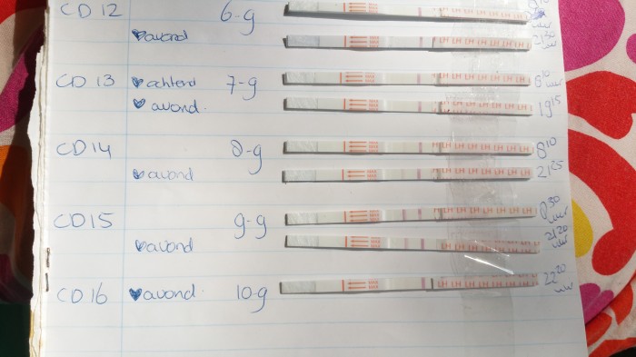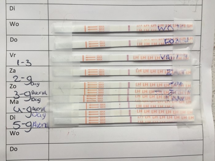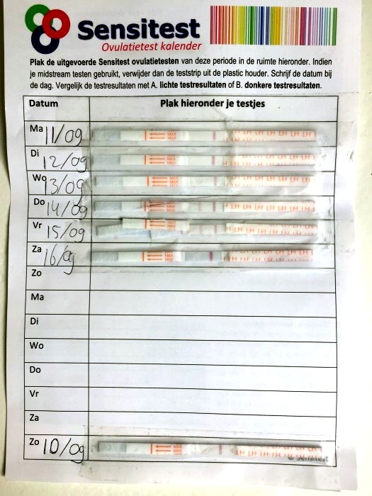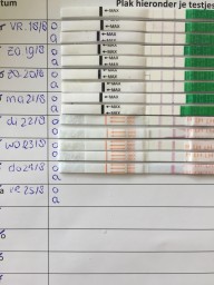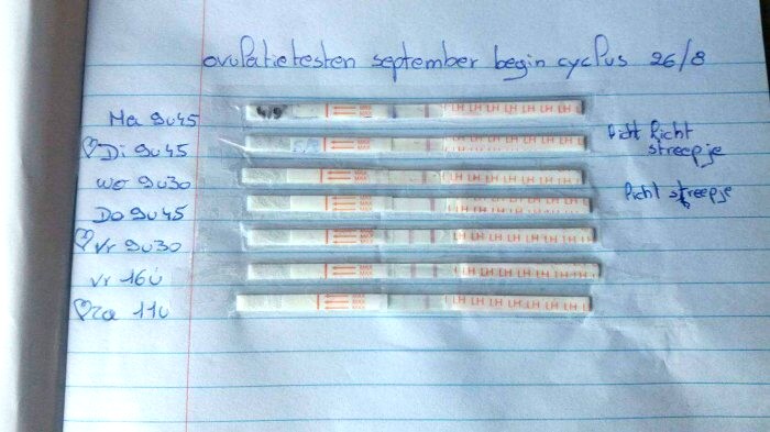 "Ovulatie test. Waarbij duidelijk twee donkere strepen zichtbaar zijn op donderdag 14/09 en vrijdag 15/09. Op zaterdag 16/09 zie je dat deze alweer vervaagd. Dus is leuk te zien wanneer de piek aanwezig is. Volgens de uitreken tabellen was dit gepland op 12/09. Dus dat scheelt toch echt een aantal dagen"