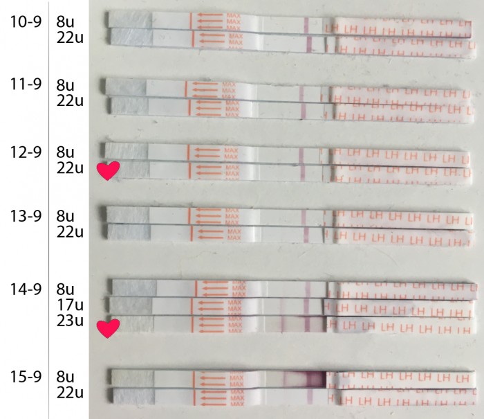 Onze reactie: "Mooie testresultaten. Wat fijn dat het goed heeft gewerkt. Op 9 september heb je een mooie LH piek gehad. Vanaf 23 september kun je aan de slag met zwangerschapstesten."