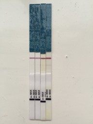 Onze reactie: "Wat een mooi verhaal. Van links naar rechts zie je een zwangerschap opbloeien. De testlijntjes (in dit geval de onderste) worden langzaamaan zichtbaar. In het prille begin van je zwangerschap is het hCG nog laag en krijg je hele lichte testuitslagen. Als je na een paar dagen opnieuw een zwangerschapstest doet worden de lijntjes donkerder. Heel veel succes met je zwangerschap."